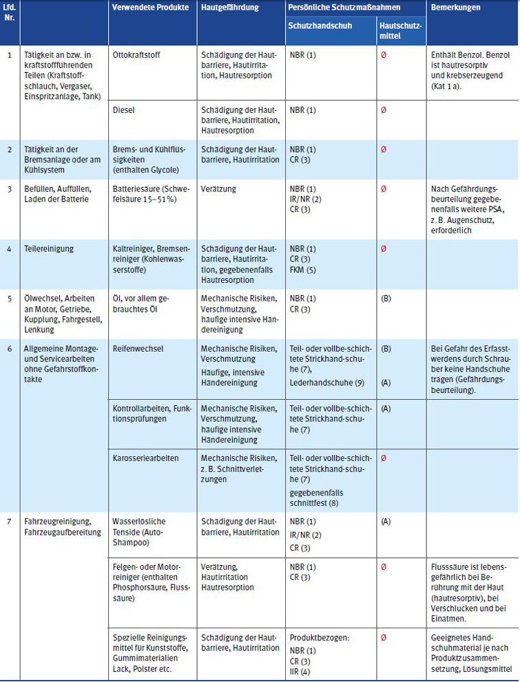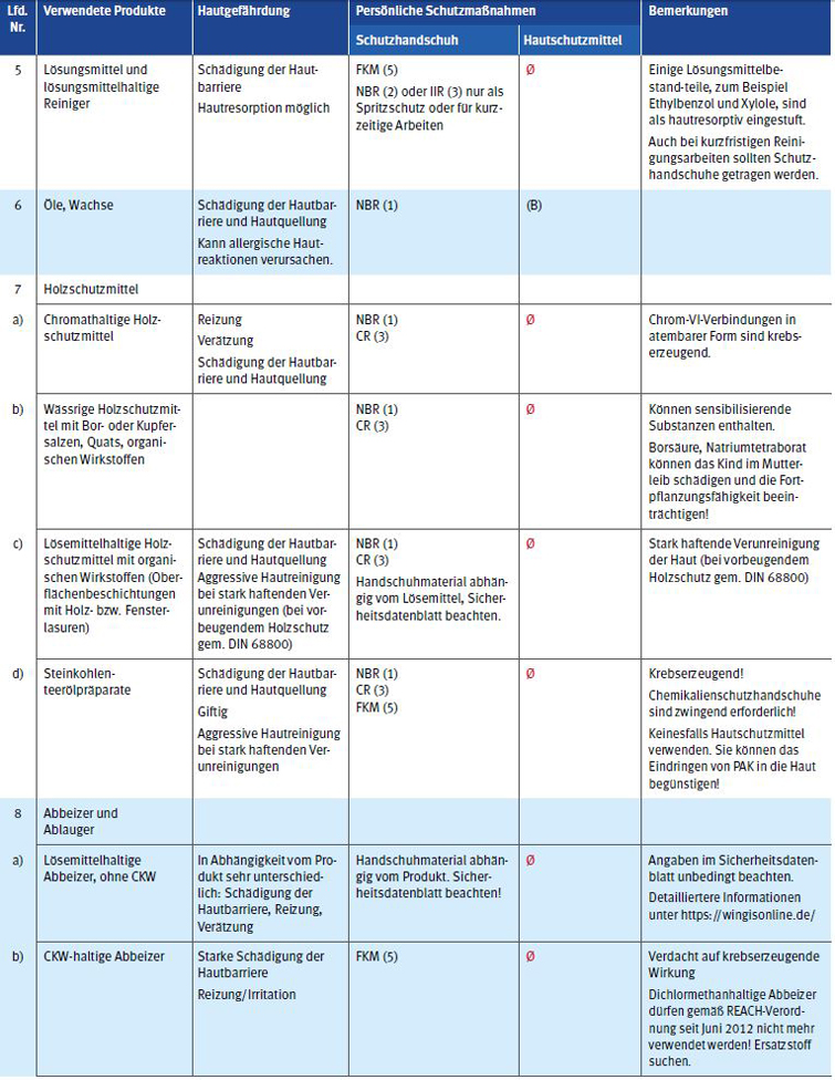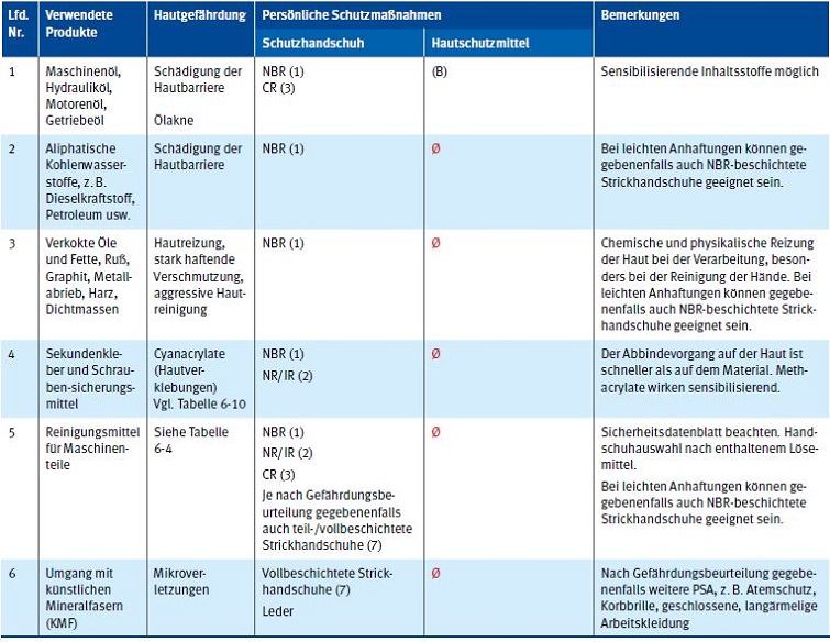 Dieser Abschnitt kann als Hilfestellung bei der Gefährdungsbeurteilung und der Festlegung von Schutzmaßnahmen herangezogen werden. Dazu werden in den nachfolgenden Tabellen 6-3 bis 6-12 typische Hautgefährdungen an Holz- und Metallarbeitsplätzen beschrieben und persönliche Schutzmaßnahmen vorgeschlagen. Die in Tabelle 6-1 erläuterten Abkürzungen für Schutzhandschuhe sowie die in Tabelle 6-2 aufgeführten Buchstaben für die Einsatzbereiche von Hautschutzmitteln werden verwendet.