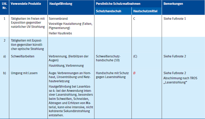Tabelle 6-12 Hautgefährdung und Maßnahmen bei UV-Exposition
