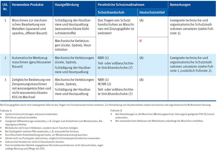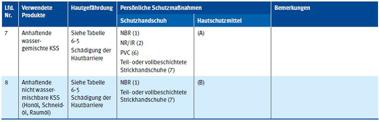 Tabelle 6-5 Hautgefährdung und Maßnahmen bei Tätigkeiten mit Kühlschmierstoffen