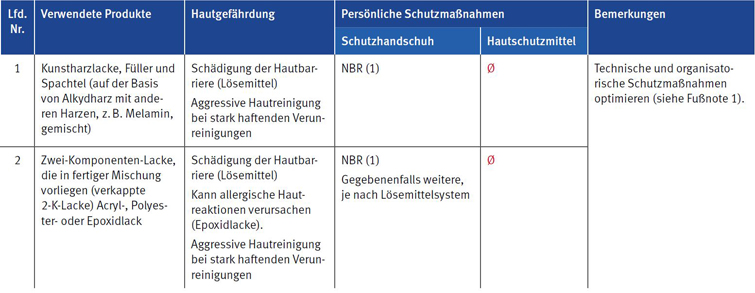 Tabelle 6-6 Hautgefährdung und Maßnahmen bei der Oberflächenbeschichtung