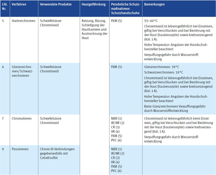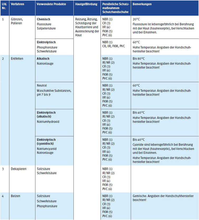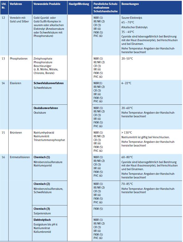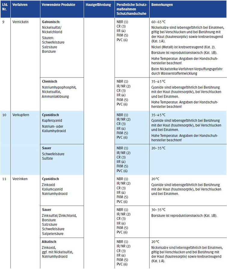 Das Verwenden von Hautschutzmitteln bei Tätigkeiten in der Galvanik ist keine geeignete Schutzmaßnahme. Es werden daher nur potentiell geeignete Handschuhmaterialien benannt.