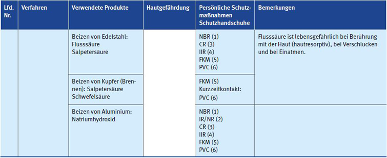 Tabelle 6-7 Hautgefährdung und Maßnahmen in der Galvanik