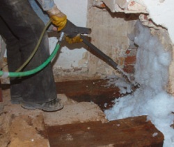 Wasserlösliche Holzschutzmittel, die bei Zugabe eines Schaumbildners mit Hilfe von Druckluft verschäumt werden können, werden als Schaum auf das Holz aufgebracht. Das Verfahren wird eingesetzt, um größere Wirkstoffmengen aufzutragen und die Einwirkzeit zu verlängern.