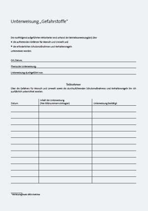 Hierzu müssen Betriebsanweisungen erstellt werden. Die regelmäßige Unterweisung ist durch Unterschrift zu bestätigen. Ein Exemplar der Betriebsanweisung ist an den Arbeitsplätzen auszuhängen.