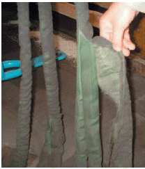 Anschlagmittel aus Chemiefasern sind während des Gebrauchs auf augenfällige Mängel hin zu beobachten. Werden Mängel festgestellt, welche die Sicherheit beeinträchtigen, sind die Chemiefaserhebebänder der weiteren Benutzung zu entziehen.