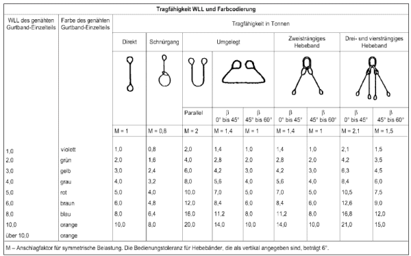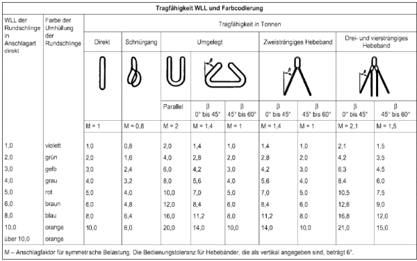 Die nachfolgenden Tabellen stellen die Tragfähigkeit der unterschiedlichen Anschlagmittel dar. Nicht jede in den nachfolgenden Tabellen genannte Anschlagart ist für jeden Lastenanschlag geeignet. Die Eignung ist in jedem Einzelfall zu prüfen. Die Nenntragfähigkeit eines Einzel-Hebebandes entspricht der Tragfähigkeit in der Anschlagart "direkt" mit einem Neigungswinkel von 0°.