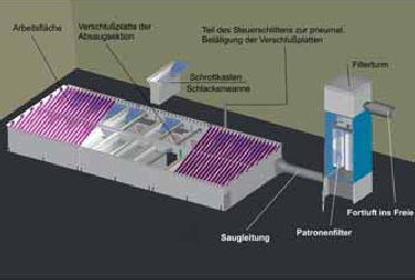 Da beim Brennschneidvorgang die entstehenden Schadstoffe überwiegend nach unten, d. h. in den Brenntisch hinein, gerichtet sind, werden sie unterhalb der Werkstückauflage erfasst und ins Freie fortgeleitet. Aus Gründen des Umweltschutzes wird die abgesaugte, Schadstoff beladene Luft vor dem Fortleiten ins Freie gefiltert (Einhaltung der Grenzwerte nach TA-Luft).