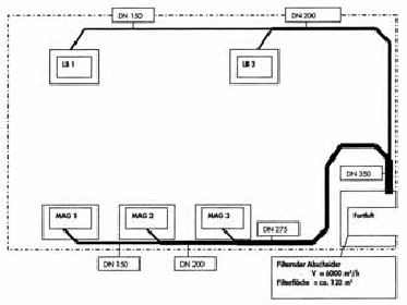 Damit während der Schweißarbeiten die Staubgrenzwerte eingehalten werden, ist in der Werkstatt eine zentrale Absauganlage errichtet worden. Die Reinluft wird als Fortluft nach außen abgeführt.