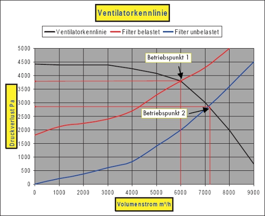 Der anfängliche Betriebspunkt 1 (Filter unbelastet) liegt bei 2875 Pa und 7150 m³/h. Nach einer bestimmten Betriebsdauer stellt sich der Betriebspunkt 2 (Filter belastet) ein, der Absaugvolumenstrom sinkt auf 6000 m³/h, der Druckverlust steigt auf 3800 Pa (siehe Abbildung 22 Ventilatorkennlinie). Um den Betriebspunkt 1 wiederherzustellen, müssen die Filter mit abgereinigt werden.