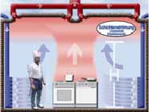 Luftströmungen und Bewegungen vor dem Abzug können die Strömungsverhältnisse im Abzug (Abbildung 53) stören und zu einem Schadstoffaustritt durch die Arbeitsöffnung in den Atembereich des Bedieners führen.