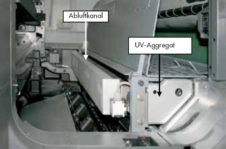 Um die Exposition gegenüber Ozon zu begrenzen, werden UV-Aggregate heute üblicherweise mit stationären Luftabsaugungen ausgestattet, die das Ozon nach außen abführen und so aus dem Drucksaal entfernen. Dadurch wird gewährleistet, dass die neben der UV-Strahlung erzeugte Wärme und das gebildete Ozon nicht in den Arbeitsraum gelangen können. Dabei ist darauf zu achten, dass die Maschinenverkleidung vollständig angebracht ist, denn nur so sind eine wirksame Schadstofferfassung und damit eine ausreichende Absaugung gewährleistet.