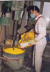 Ein Gesamtansatz von ca. 400 kg wird über einen Zeitraum von 30 Minuten relativ offen gemischt (Abbildung 48), dabei werden ca. 100 kg Gelbpigment (Bleisulfochromatgelb) als Sackware manuell zugegeben. Am Rande des Mischbehälters befand sich ein schmaler Absaugtrichter. Eine personenbezogene Messung zeigte eine deutliche Staubbelastung des Beschäftigten (4,1 mg/m³) und eine mehrfache Überschreitung der bis Ende 2004 geltenden Grenzwerte für Blei und Chrom (VI).