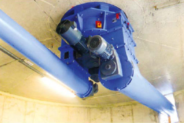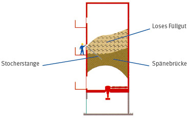 Bereits eingetretene Fließstörungen, wie Späne-Brücken, Schächte bzw. sog. Rattenlöcher, aber auch Anbackungen an den Silowänden, können über eine Zugangsöffnung im Silodach mittels pneumatischer oder mechanischer Reinigungsverfahren ohne Betreten des Späne-Lagerbereiches beseitigt werden.
