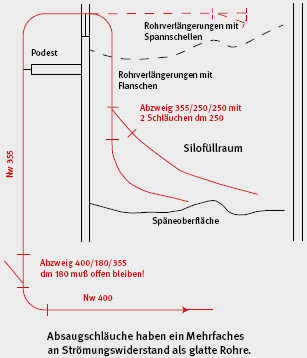 Um ein Silo durch Absaugen des Späne-Materials zu leeren, muss eine separate Absaugleitung gelegt und an einen leistungsfähigen Ventilator angeschlossen werden. Die abgesaugten Späne können dann in einen Container zum Abtransport oder auch in ein anderes Silo auf dem Betriebsgelände gefördert werden. Die Rohrleitung sollte aus glatten Metallrohrteilen bestehen, da flexible Absaugschläuche einen deutlich höheren Strömungswiderstand haben als glatte Rohrleitungen. Lediglich die letzten wenigen Meter bis zum Absaugstutzen können wegen der notwendigen Bewegungsfreiheit flexibel gestaltet werden. Auf durchgängige Erdung der gesamten Leitung ist zu achten!