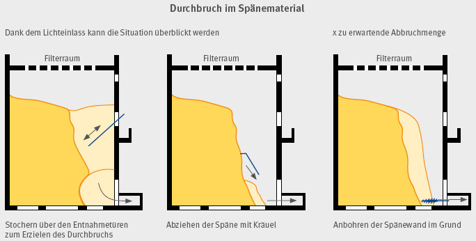 Sind in breiten Silos mehrere nebeneinanderliegende Türen vorhanden, muss von allen Türen her vorgegangen werden, bis der Durchbruch durch das Späne-Material auf der ganzen Silobreite erfolgt ist.