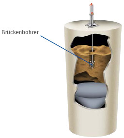 Brücken müssen zunächst mit einem Bohrer durchstoßen werden, um so die Bedingungen eines schmalen Schachtes zu schaffen. Anschließend kann das Material, wie oben beschrieben, durch stetige Aufweitung des Schachtes abgeschlagen und der Austragung zugänglich gemacht werden.