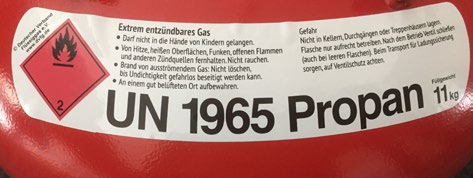 Druckgaspackungen und Einwegkartuschen mit Flüssiggas sind vom Hersteller unter anderem mit dem Gefahrensymbol (Abbildung 3), der Gefahrenbezeichnung und folgenden Hinweisen zu kennzeichnen: "Behälter steht unter Druck. Vor Sonnenbestrahlung und Temperaturen über 50 °C schützen. Auch nach Gebrauch nicht gewaltsam öffnen oder verbrennen. Nicht gegen Flamme oder auf glühenden Gegenstand sprühen. Von Zündquellen fernhalten – Nicht rauchen. Außer Reichweite von Kindern aufbewahren".