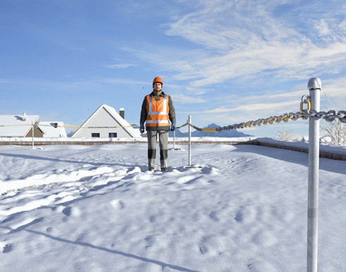 Lassen sich aus arbeitstechnischen Gründen die vorgenannten Maßnahmen nicht umsetzen, z. B. an den Abwurfstellen, kann in diesen Bereichen PSA zum Schutz gegen Absturz verwendet werden. Um die schneebedeckten Anschlageinrichtungen besser auffinden zu können, empfiehlt es sich diese im Vorfeld durch z. B. vertikale Pfosten zu markieren.