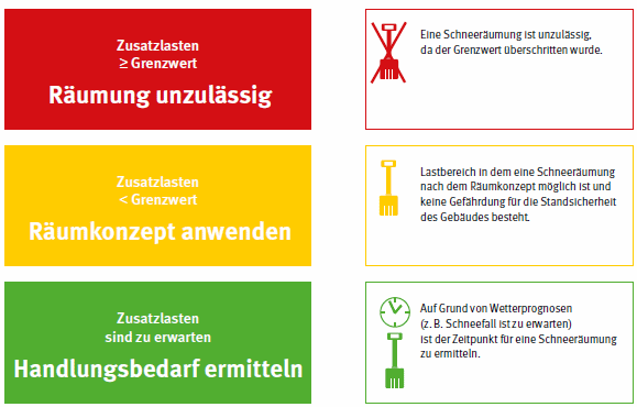 Die Bestimmung des aktuellen Zustandes des Gebäudes und die für die Durchführung der Schneeräumung erforderlichen statischen Überprüfungen sind durch eine fachkundige Person durchzuführen. Zur sicheren Durchführung der Schneeräumung ist ein Grenzwert zu bestimmen, der im Rahmen der Gefährdungsbeurteilung für das Sicherheitskonzept zu ermitteln ist. Dieser ergibt sich aus der zulässigen Zusatzlast verringert um einen Sicherheitsbeiwert. Bis zu diesem Grenzwert ist eine Schneeräumung noch zulässig.