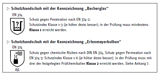 Ein Chemikalienschutzhandschuh, der mit einem Erlenmeyerkolben-Piktogramm gekennzeichnet ist, wurde gegen drei Chemikalien aus einer Liste (siehe Anhang 7) geprüft. Die zutreffenden Kennbuchstaben der Chemikalien sind Bestandteil der Kennzeichnung. Er kann bei Tätigkeiten mit den in der Herstellerinformation benannten Chemikalien für begrenzte Zeit eingesetzt werden.