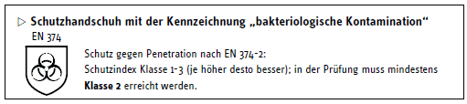 Ein Chemikalienschutzhandschuh kann zusätzlich auch mit dem Piktogramm für „bakteriologische Kontamination“ gekennzeichnet sein. Zurzeit wird angenommen, dass Schutzhandschuhe, die bei der Prüfung der Penetration widerstehen, einen wirksamen Schutz gegen Bakterien und Pilzsporen bieten. Diese Annahme gilt nicht für den Schutz gegen Viren, denn Viren sind von der Größe her wesentlich kleiner als Bakterien und Pilzsporen.
