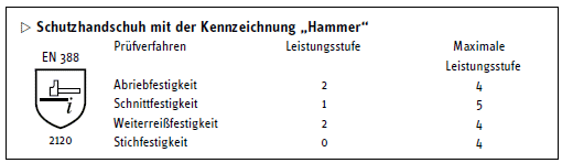 Für Chemikalienschutzhandschuhe bestehen keine Mindest-Anforderungen an die mechanische Schutzwirkung. Im Rahmen der Zertifizierungen werden diese Prüfungen aber in der Regel durchgeführt und die Ergebnisse in der Herstellerinformation angegeben. Auch unter diesem Piktogramm findet man die Leistungsstufen wieder.