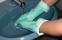 - Bei Verwendung von Säuren oder alkalihaltigen Produkten: Schutzhandschuhe unter dem Wasserhahn abspülen und mit einem sauberen Tuch abtrocknen.