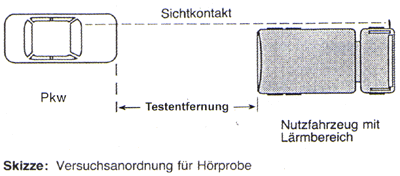 Außerhalb des öffentlichen Verkehrsraumes, z.B. auf einem Betriebshof, werden direkt hintereinander das Fahrzeug mit Lärmbereich am Fahrerarbeitsplatz und ein Pkw aufgestellt (siehe Skizze). Die Versuche sind auf einem freien Platz mit möglichst glatter Oberfläche bei Windstille durchzuführen. Hindernisse, wie Bäume, Sträucher und anderes, die durch Widerhall oder Dämpfung das Ergebnis beeinflussen können, müssen von dem Pkw mindestens doppelt so weit entfernt sein wie der Fahrerarbeitsplatz. Ist es unvermeidbar, den Versuch im öffentlichen Straßenverkehr durchzuführen, sind die Bestimmungen des § 30 der Straßenverkehrsordnung (StVO), wonach unnötiger Lärm bei der Benutzung von Fahrzeugen verboten ist, zu berücksichtigen. Es muss eine Verständigungsmöglichkeit der Testperson am Fahrerarbeitsplatz mit Lärmbereich und dem Pkw gewährleistet sein, z.B. durch Handzeichen, Blickkontakt oder optische Signale.
