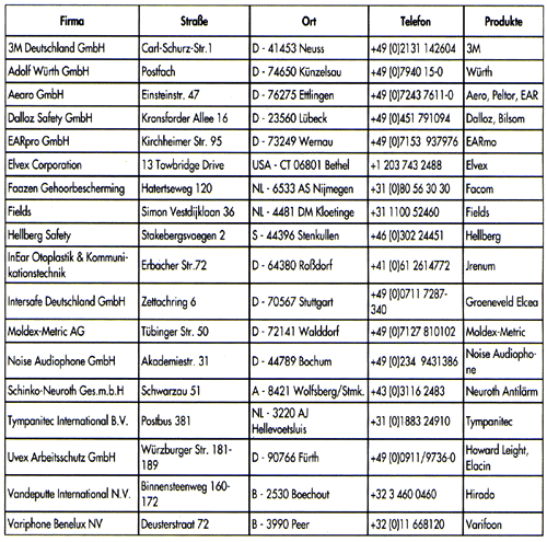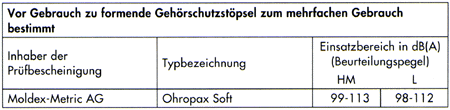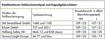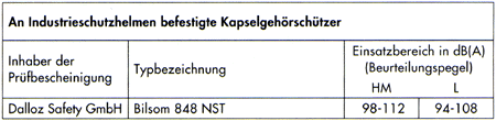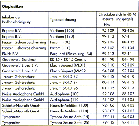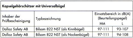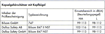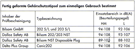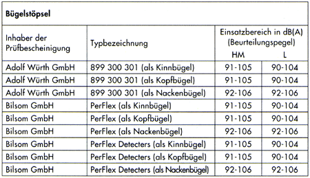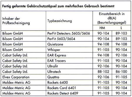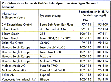 Tabelle 1: Liste geeigneter und geprüfter Gehörschützer