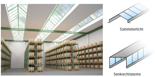 Der Tageslichteinfall durch Dachoberlichter wird durch die Größe und die Lage sowie das Material der lichtdurchlässigen Fläche bestimmt.