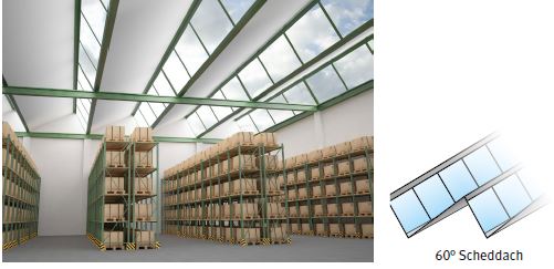 Brandschutz: Entsprechend ausgerüstete Dachoberlichter dienen als Rauch- und Wärmeabzug. Im Brandfall führen sie in Verbindung mit aktivierten Zuluftöffnungen Hitze und gefährliche Rauchgase unverzüglich aus dem Gebäude ab. Die Selbst- und Fremdrettung von Personen, die sich im Gebäude aufhalten, sowie die Brandbekämpfung werden dadurch erleichtert.