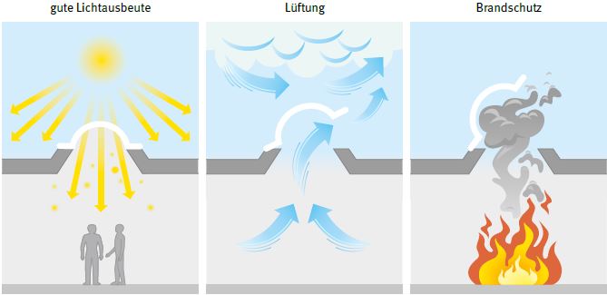 Im Rahmen des Brandschutzkonzepts dienen Lichtkuppeln zusätzlich als Rauch- und Wärmeabzugsanlagen.
