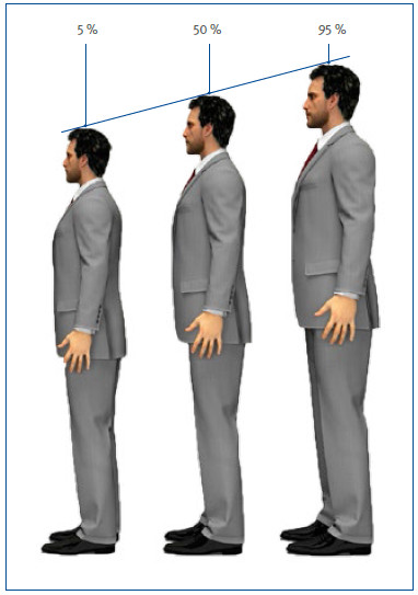Die Arbeitsmittel müssen so gestaltet sein, dass einem möglichst großen Kreis von Benutzern mit unterschiedlichen Körpermaßen die Erledigung verschiedener Arbeitsaufgaben in ergonomischen Körperhaltungen ermöglicht wird. Bei der Gestaltung von Arbeitsmitteln werden die statistisch abgeleiteten Perzentile der Maße erwachsener Menschen (Altersgruppen 18. bis 65. Lebensjahr) zugrunde gelegt. Dabei gibt ein Perzentilwert an, wie viele Menschen unter oder über dem betreffenden Wert mit ihren Körpermaßen liegen (Abbildung 25).