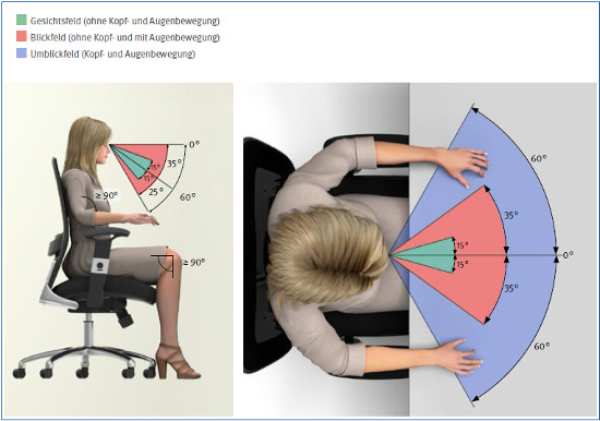 Von Bedeutung für ergonomische Sitz- und Stehhaltungen sind außerdem Greifräume, Blickfelder, Sehabstände und Bewegungsabläufe. Um ausreichend Raum für ergonomische Arbeitshaltungen zu gewährleisten, müssen auch die Anordnung und Einstellung der Arbeitsmittel berücksichtigt werden.