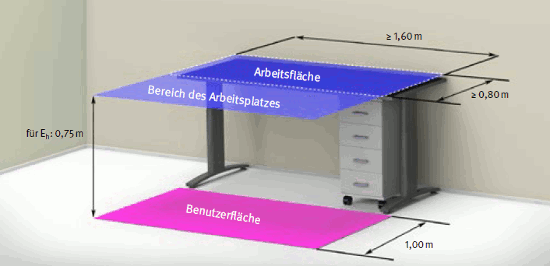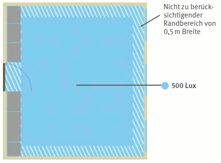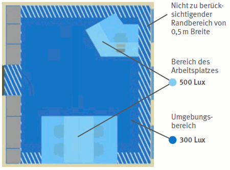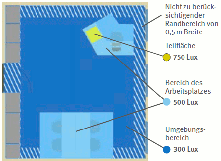 Ein ausreichendes Beleuchtungsniveau erfordert am Arbeitsplatz einen Mindestwert der Beleuchtungsstärke von 500 Lux. Diese Beleuchtungsstärke muss nicht für den gesamten Raum, sondern kann auch nur im Bereich des Arbeitsplatzes ausgeführt sein. Im übrigen Raumbereich, im Umgebungsbereich, ist ein Mindestwert der Beleuchtungsstärke von 300 Lux notwendig (Abbildung 40).