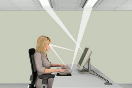 Außerdem können die Beleuchtungsart und eine entsprechende Anordnung der Leuchten dazu beitragen, Reflexblendung zu vermeiden. So sollten zum Beispiel nach unten offene Leuchten, bei denen die Lampen einsehbar sind, nicht direkt über dem Arbeitsplatz, insbesondere über den Beschäftigten angeordnet werden.