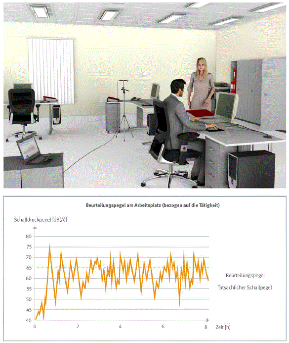 Abbildung 47: Lärmmessung im Büro und Messergebnis (Beurteilungspegel)