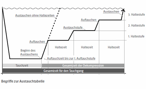 3.5 Hat ein Taucher versehentlich Haltezeiten nicht eingehalten, hat er sofort nach dem Erreichen der Wasseroberfläche wieder auf die Haltestufe abzutauchen, die er als Erste zu schnell verlassen hat. Für die Bestimmung der Haltezeiten des nachgeholten Austauchens ist die Zeit des vorangegangenen Tauchganges um die Zeit zu verlängern, die zum erneuten Erreichen der untersten zu schnell verlassenen Haltestufe erforderlich ist.