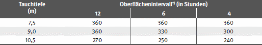 *) Oberflächenintervall ist die Zeit zwischen Beendigung der Dekompression des ersten Tauchganges und Beginn des Wiederholungstauchganges