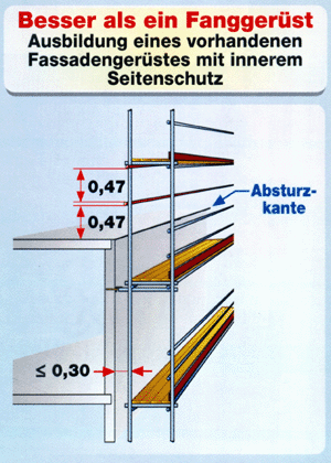 Die Ausbildung eines vorhandenen Fassadengerüstes mit innerem Seitenschutz ist besser als ein Fanggerüst.