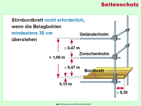 Stirnbordbrett nicht erforderlich, wenn die Belagbohlen mindestens 30 cm überstehen.