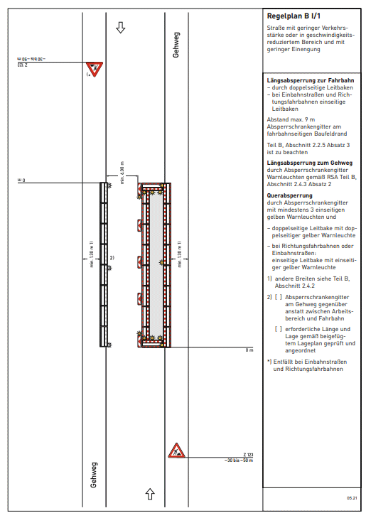 - Bei der Erstellung des Verkehrszeichenplans werden erforderliche Platzbedarfe für Arbeitsplätze, Verkehrswege, Sicherheitsabstände und technische Schutzmaßnahmen gemäß ASR A5.2 berücksichtigt