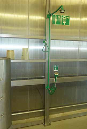 Beim Umgang mit Säuren und Laugen, Abbeizern, lösemittelhaltigen Produkten, Kraftstoff oder Zement sind Augenduschen am Arbeitsplatz bereit zu halten.