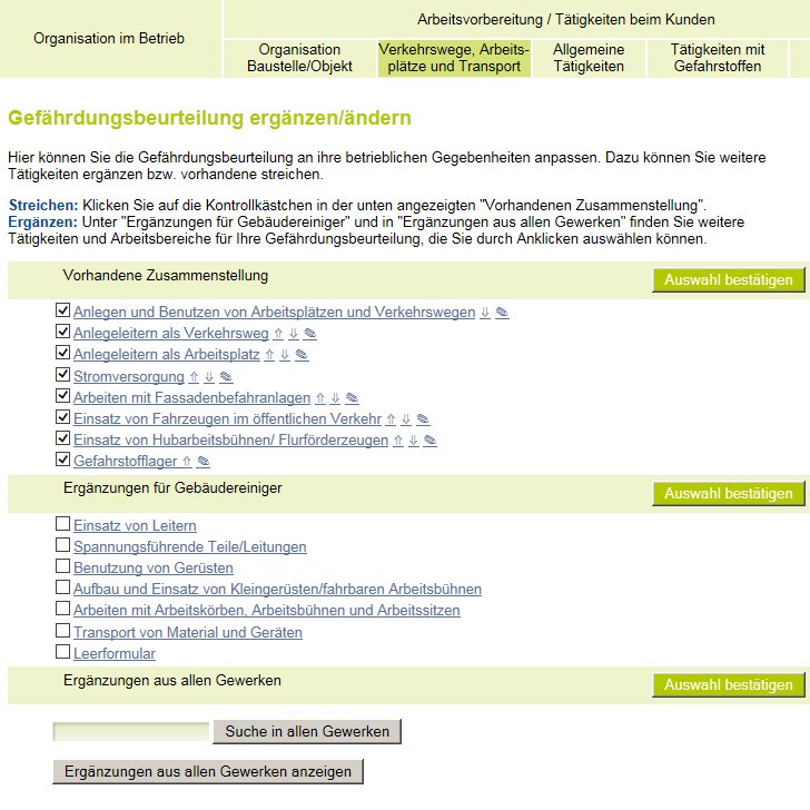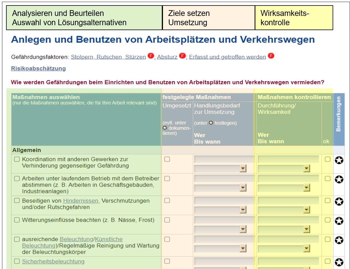 Soll beim ersten Durchgang der Handlungsanleitung nur über die Frage entschieden werden, ob für ein Thema eine generelle Regelung erforderlich ist, wird durch einfaches Anklicken, unter „Basisprozesse und -maßnahmen“ dieses Thema in die Liste „Handlungsbedarf nach Gefährdungsbeurteilung“ übernommen. Die derart reduzierte Anzahl relevanter Themen kann dann sukzessive abgearbeitet werden.