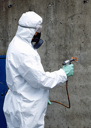 dass Atemschutzgerät und Schutzanzug dicht miteinander verbunden sind, Staub nicht ins