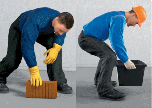 Leichte Lasten werden mit leicht gebeugten Knien aufgenommen, wobei der Oberkörper mit dem Unterarm auf dem Oberschenkel abgestützt wird.
