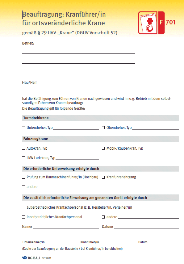 Formular Kranführer/-in bei ortsveränderlichen kraftbetriebenen Kranen