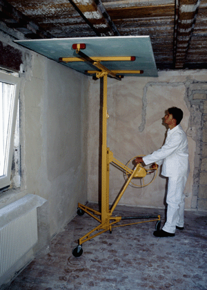 Körperliche Belastungen durch das Heben, Tragen und Halten von Platten können durch den Einsatz von Transportwagen und Montageliften bei Trockenbauarbeiten wirksam vermindert werden.