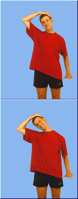 Die rechte Hand an das linke Ohr legen und den Kopf langsam nach rechts ziehen - halten.