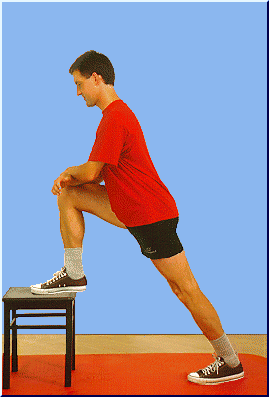 Hüftbeugedehner Mit großem Schritt ein Bein auf einen Stuhl oder ähnliches stellen.